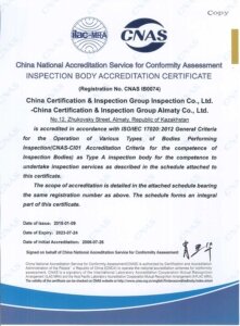 ТОО «CCIC Almaty» успешно прошла аккредитацию на соответствие стандарту ИСО/МЭК 17020 в качестве контролирующего органа типа А, которую провела международно признанная организация Китайский государственный аккредитационный комитет по оценке соответствия (CNAS).